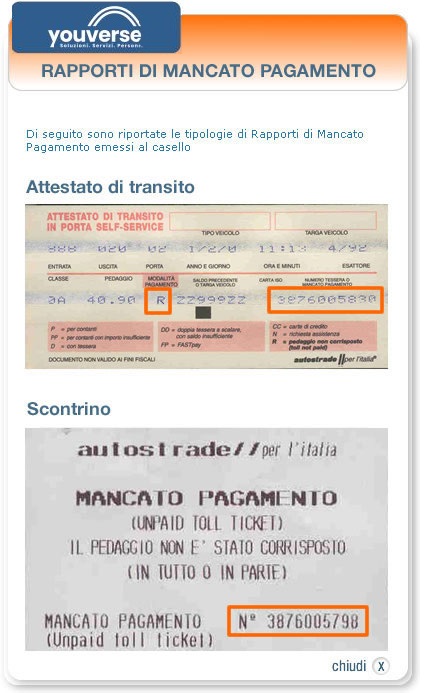 In the event that the toll due (article 176, paragraph 11 of the Italian Traffic Laws) is not paid, in whole or in part, a non-payment report is issued (transit certificate/receipt), which includes the number of the report, the vehicle’s details (registration number and class), transit data (date, time, toll booth exit and, where available, the toll booth entrance as well), the amount to be paid and the methods of payment.