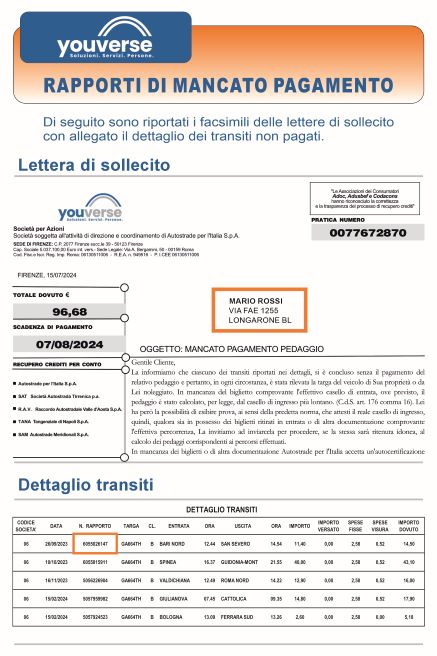 I clienti in possesso di un sollecito di pagamento o di un rapporto di mancato pagamento possono contattare la società Youverse Spa utilizzando questo FORM.
